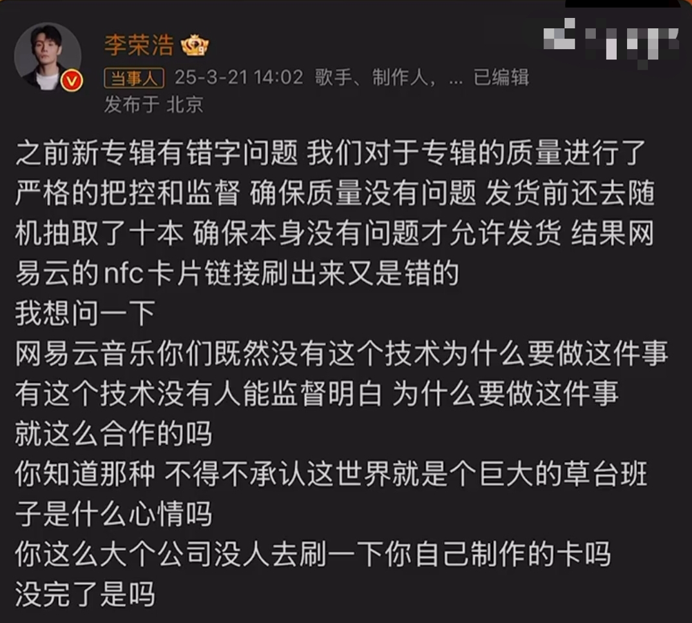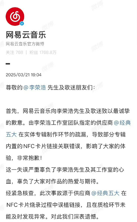 这已是网易云音乐今年第二次卷入重大争议。三个月前,李荣浩连发微博炮轰平台,因为购买其实体专辑的消费者发现,内置的NFC卡片识别后竟跳转到另一位歌手的专辑页面。
