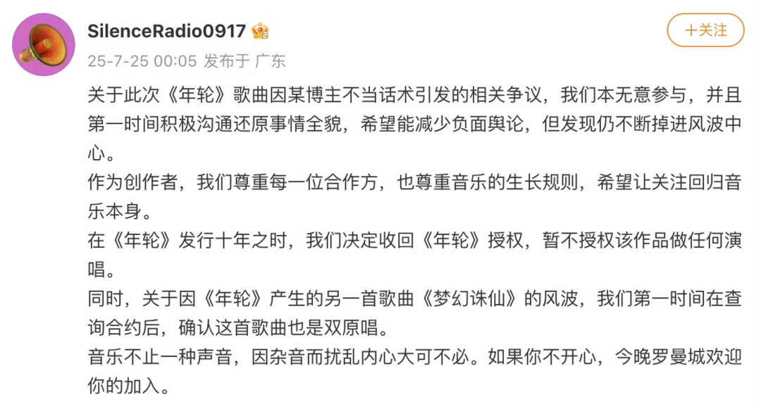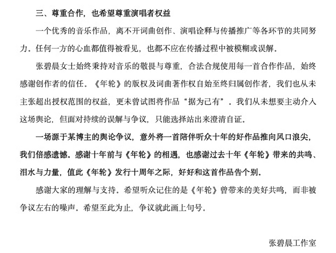 日前,有网友发现,网易云音乐突然取消了张碧晨三首歌曲的原唱标识,其中包括此前被热议的《年轮》,而汪苏泷版本的同一位置,“原唱”标签仍在。但不久后,网易云音乐又恢复了张碧晨的原唱标签。