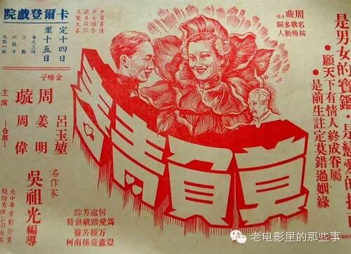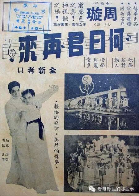 此外,这些老南洋的电影广告及宣传单上,也让人能看到当年周璇影片的一些资料。像《何日君再来》(1937)(也就是“三星伴月”),就是一个挺有趣的例子。在《何日君再来》电影广告及宣传单上的剧照,让你看到电影里,一派好莱坞30年代歌舞片的形式和舞蹈场面。这可是1937年的作品。