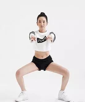张开双脚宽于肩膀。向前方抬起双臂的同时,下坐保持跟青蛙一样的姿势。然后伸直手臂,用双手碰地面的中央。举起双手至头顶。30次作为1组,重复3组。