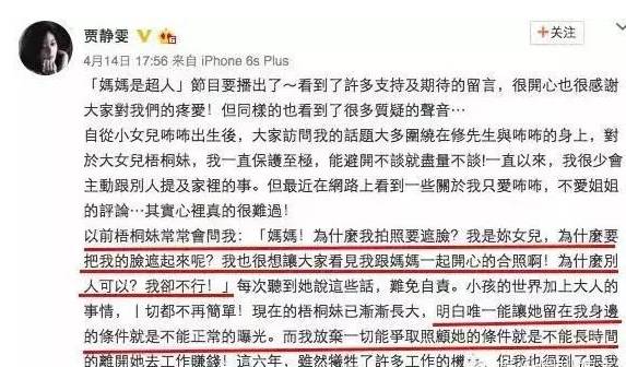 看了贾静雯发的这个长微博才知道原来一个当妈的有这么不容易,不露正脸是因为害怕失去自己的大女儿,一个母亲能够做到这样的也很不容易,真心让人心疼!真是错怪她了,希望她以后的日子能够越来越幸福!