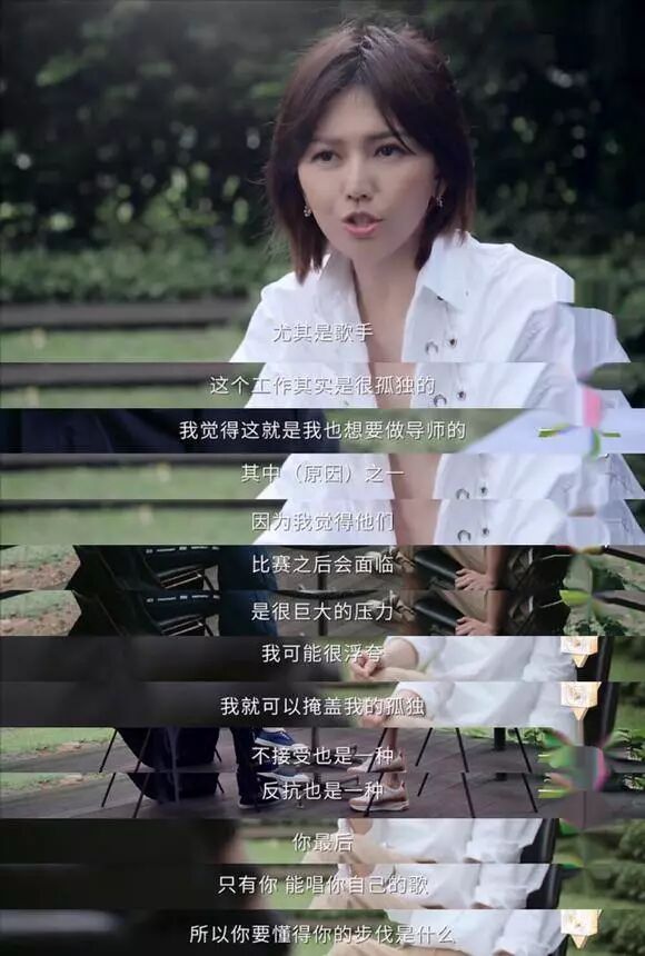 节目中的燕姿依旧一头清爽干净的黑色短发,发言温柔但一针见血。某个开口的瞬间,还是倏地一下把我拉回十多年前,她照旧是那个唱着《天黑黑》的温暖少女。