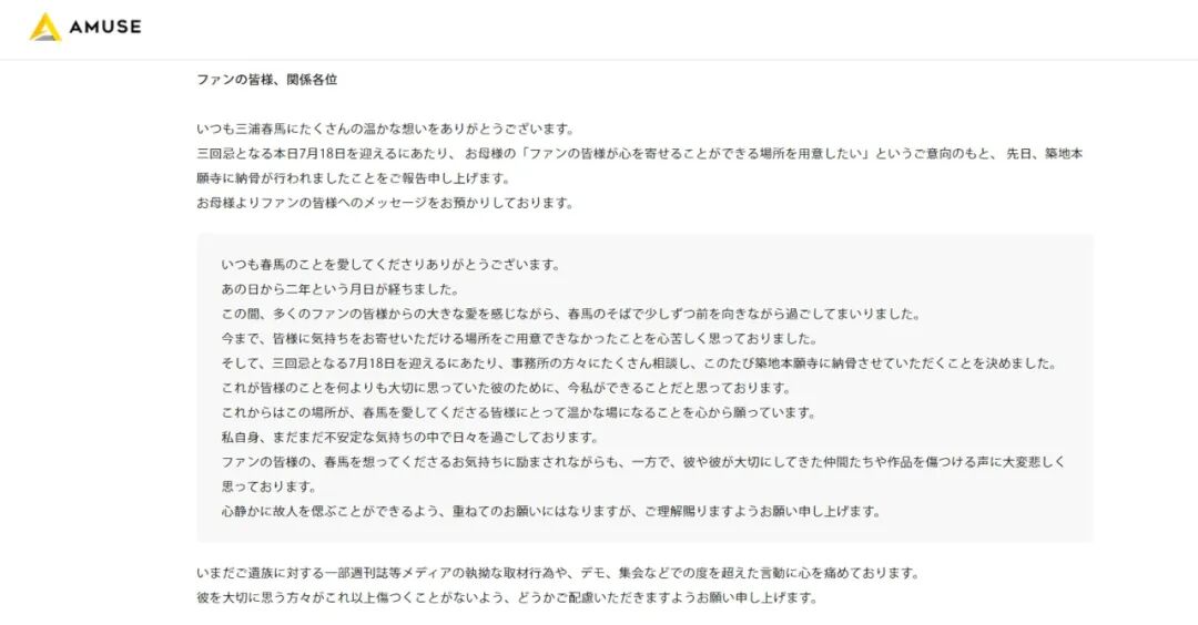 直到几天前(7月18日),Haruma去世2周年,经纪公司AMUSE在官网发出公告,三浦春马的骨灰将安放在东京筑地本愿寺,也方便粉丝吊唁。