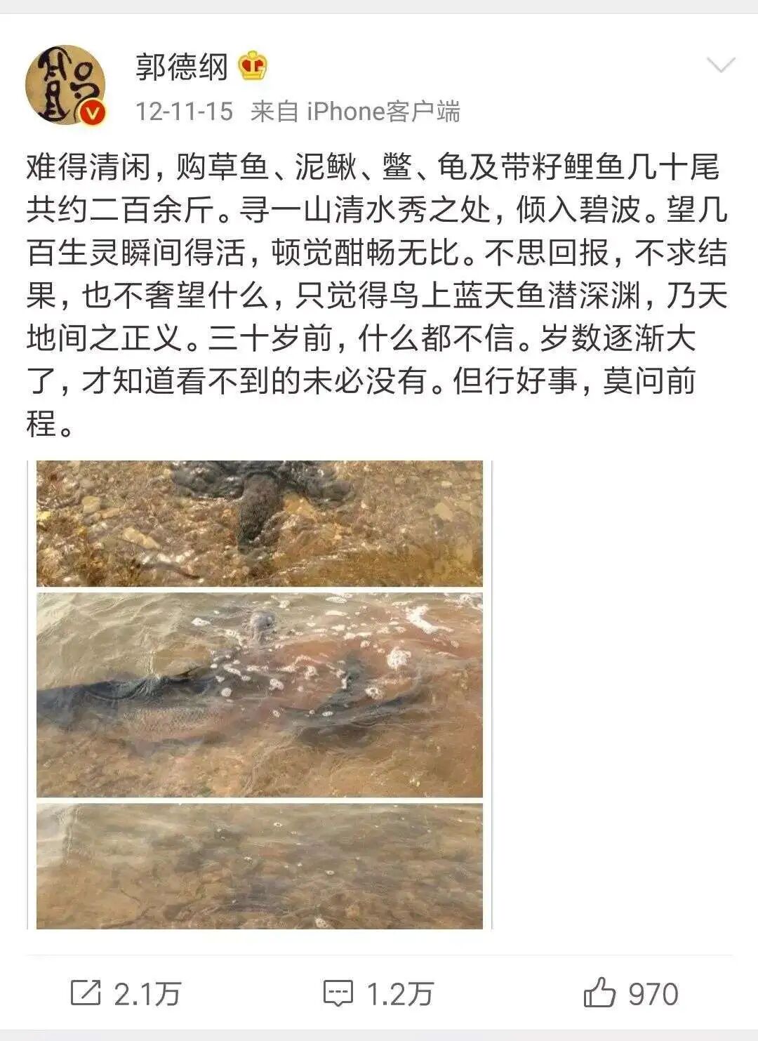 而他也确实在2012年进行过一次放生,把总共二百多斤的生灵放归溪流。