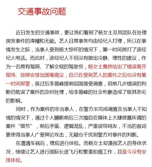 全文的主旨呢,就是痛批了李易峰经纪人杨迦茵的不作为,说到杨女士自2014年进入欢瑞公司后做了李易峰的执行经纪人,两年以来业务水平没有任何的增长,并且经常给团队造成不可挽回的损失。