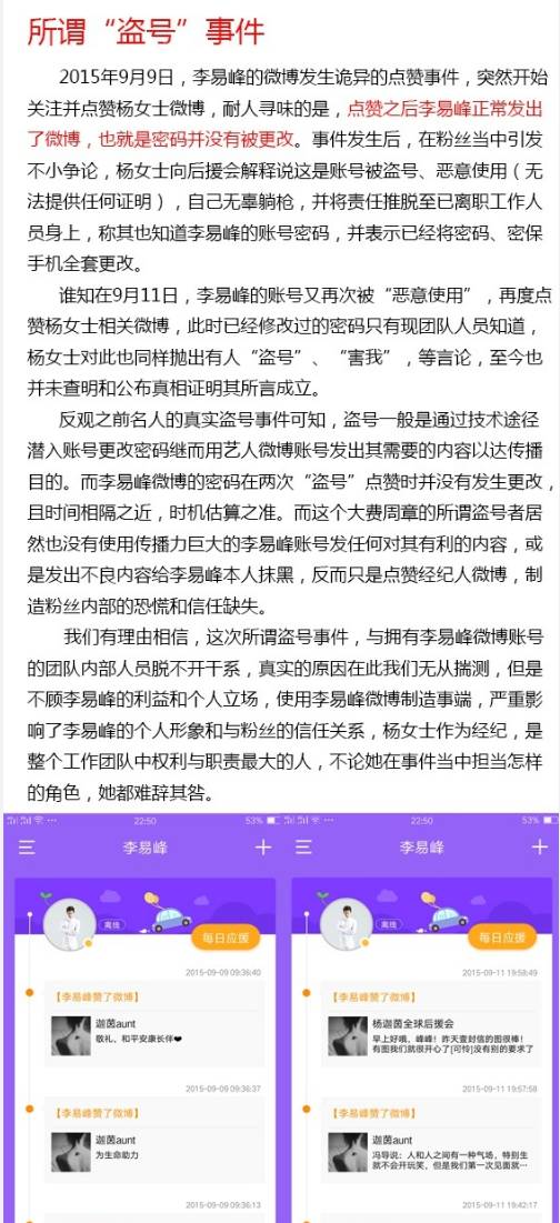 粉丝怀疑杨迦茵团队使用李易峰微博制造事端,并严重影响了李易峰的个人形象和与粉丝的信任关系