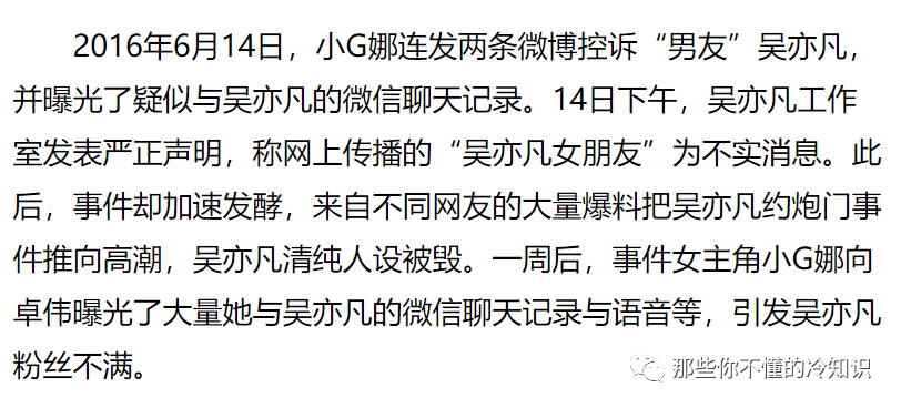 被“小G娜”爆出交往过程时,吴亦凡跟这位女网友还是“一对一”的关系,一对年轻男女释放荷尔蒙,倒很正常,可一夜之间又被曝出与多位女性关系暧昧,关系就变成“一对多”,事件的性质也不一样了。吴亦凡方发声明要告爆料的微信号,唯独没说要告(自称是吴亦凡女朋友的)“小G娜”。这种避开主要事实、指东打西的手法,被网友解读为“打脸”。但,贵圈并不是法外之地,在证据面前吴亦凡的违法手段终于暴露,2021年8月16日,吴亦凡涉嫌强奸被批准逮捕。