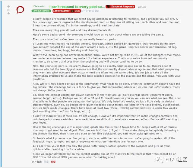 我们之前做的一直都与PUBG无关。我们也不是在试图变得更像PUBG。我们之前做的所有的改变,是因为我们这些会让H1有更好的游戏体验。这就是为什么我们从一开始就听从社区、主播和职业玩家意见的原因,并将一直这样做