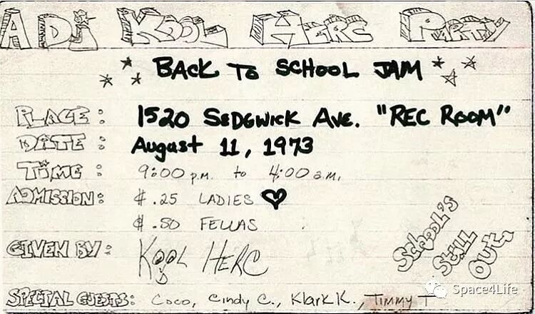 DJ Kool Herc在Bronx的一个Party上用两张相同的唱片播放音乐,这也被人们认为是Hip-Hop雏形最早出现的日子。