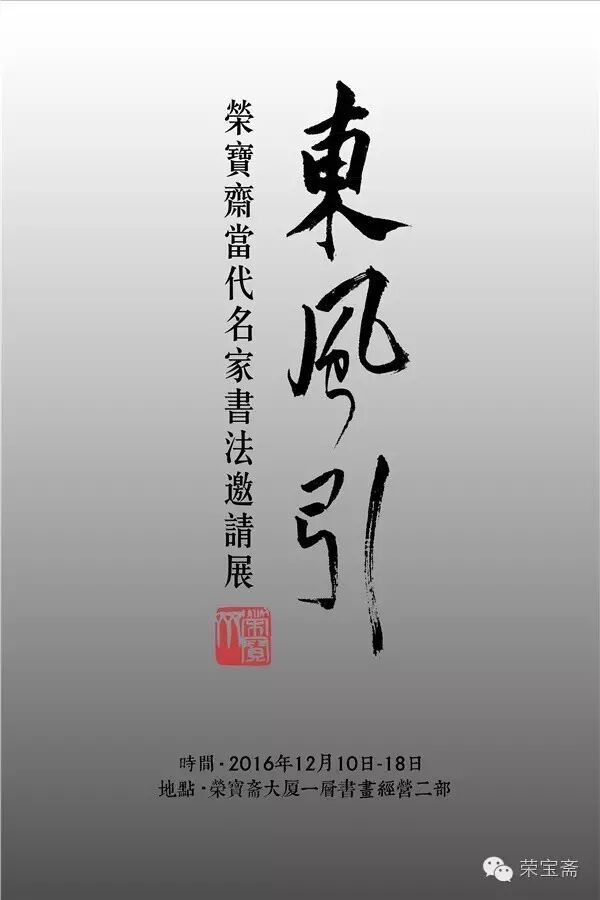 荣宝斋将于2016年12月10日—12月18日在荣宝斋书画经营二部(高端画廊)举办“东风引·荣宝斋当代名家书法邀请展”。此次展览将展出当代名家书法八十余件,由荣宝斋出版社出版的《东风引·荣宝斋当代名家书法邀请展作品集》也将同期出版发行。