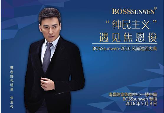 9月9日,BOSSsunwen携手南昌财富广场12周年庆举办2016风尚巡回大典,著名影视明星焦恩俊将亲临BOSSsunwen品牌专柜阐述绅士品格。