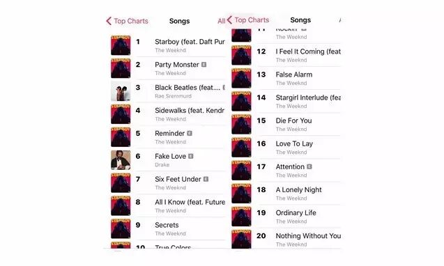 今年盆栽哥依旧没有 “刹车” 的意思,新专辑 《Starboy》 誓要再次突破自己,还特地推出了一个微电影 《MANIA》 进行宣传。成绩如何?我们还是来看看最直观的榜单情况吧。反正我自己是已经专辑列表循环好几天了,随口都能哼出 “I'm a motherfu*king Starboy”...