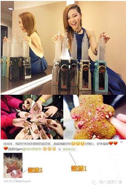庆功宴迟到,让大家干等,解释说补完妆立马就赶来了,但事后被爆是在化妆间跟奖项自拍,啪啪啪地打脸啊