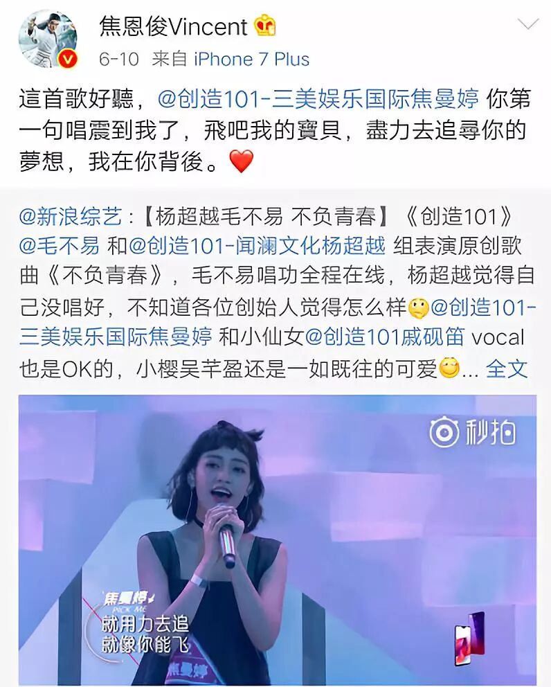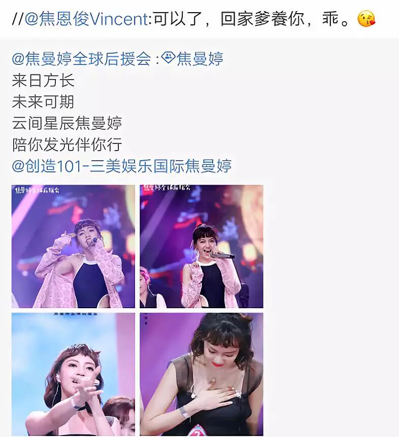 焦曼婷离开《创造101》的时候,他贴心地鼓励:回家爹养你,乖。