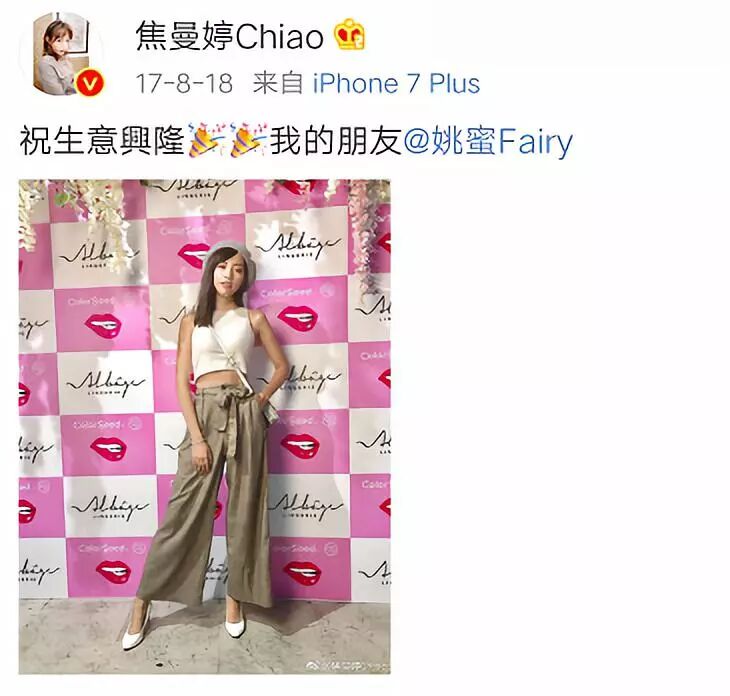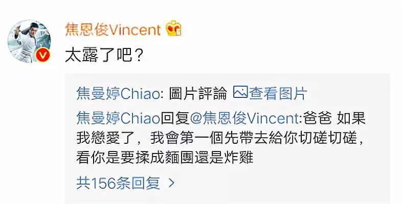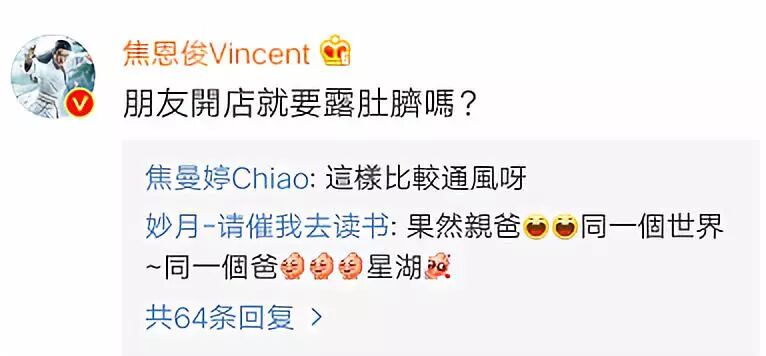 比如焦曼婷晒出来朋友开店典礼的照片,他就在底下留言:朋友开店就要露肚脐吗?