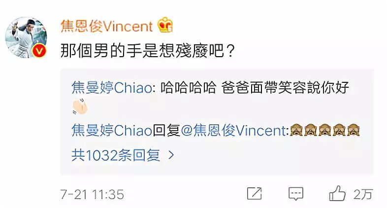 焦恩俊在微博底下评论:那个男的手是想残废吧?