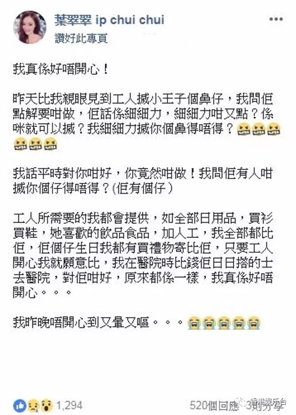 育有两子嘅前港姐叶翠翠,现时主力相夫教子,但点知佢喺社交网大吐苦水,话目击到家佣搣一岁大仔「小王子」个鼻,令佢感到十分心痛之馀,仲唔开心到又晕又呕,佢话:「我真系好唔开心!比(畀)我亲眼见到工人搣小王子个鼻仔,我问佢点解要咁做,佢话系细细力,细细力咁又点?系咪就可以搣?我细细力搣你个鼻得唔得?」