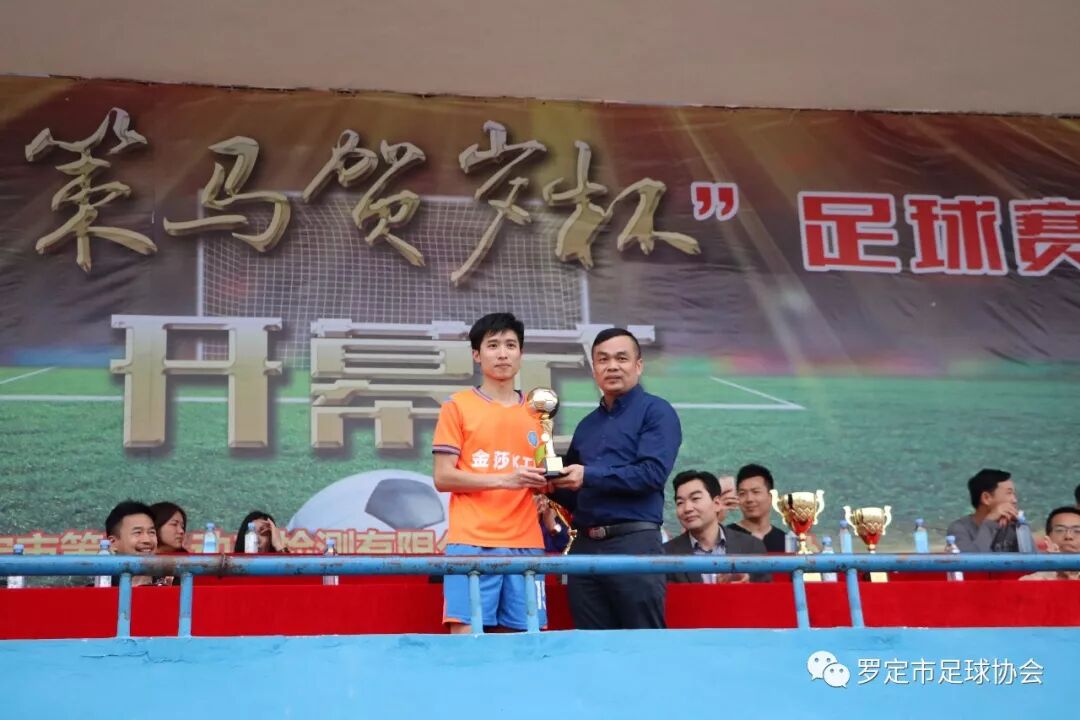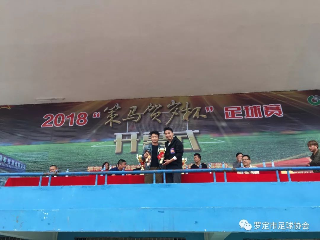 罗定市足球协会会长欧夏(左)为获得“最佳青年队”的风行青年队颁奖。