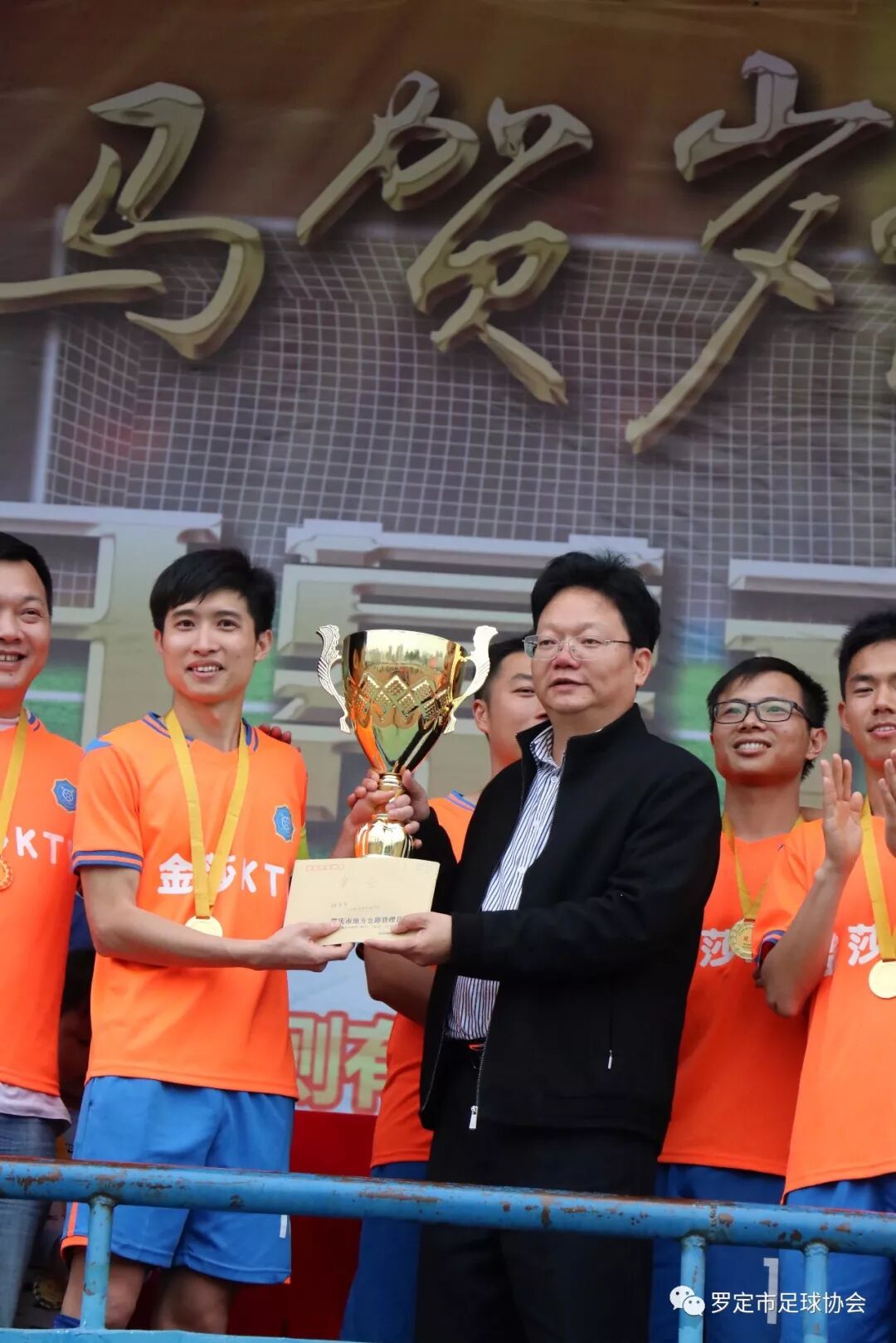 罗定市足球协会会长欧夏(右)为获得本次比赛季军的围底新势力队颁奖