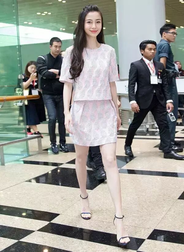 粉嫩嫩的套装有没有拴住你一颗向往少女的心?baby那高挑的身材加上简单的高跟鞋,提花的浅蓝色印花在甜腻的粉色上钦点出了清纯气息。