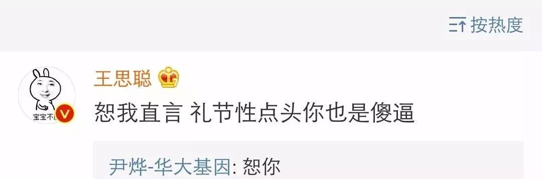 王老吉官方还发了个微博:“不是我吹牛,连华大基因总裁都高度认同”。随后华大基因老总发微博澄清:只是礼节性的点个头。许久未发微博的“纪委书记”王思聪在华大基因老总下面怒骂:傻叉!(可戳视频具体了解发生了啥)