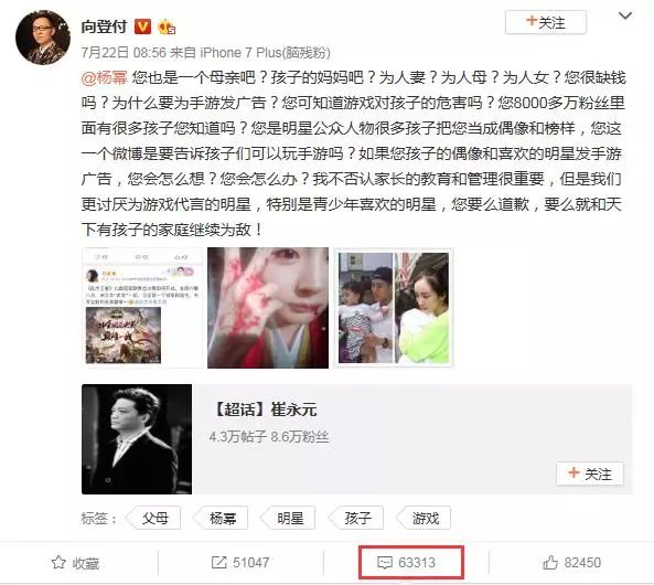 尤其最后大V还特别有煽动力的喊出一句【你就是和天下有孩子的家庭为敌】,合着全天下孩子沉迷游戏,这个锅都应该是明星代言人的锅?自己家孩子学不好,全天万物皆是锅?按他这概念,每年酒驾车祸死了这么人,那么那些酒水广告的代言人就都是杀人凶手没跑了。