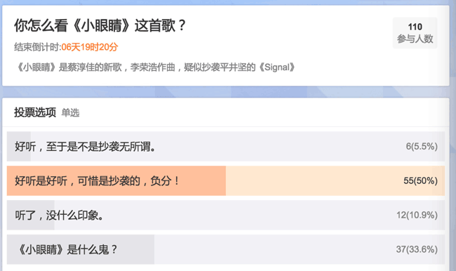 上图是新音乐产业观察在微博上做的小调查,结果显示网友对《小眼睛》的印象偏负面。