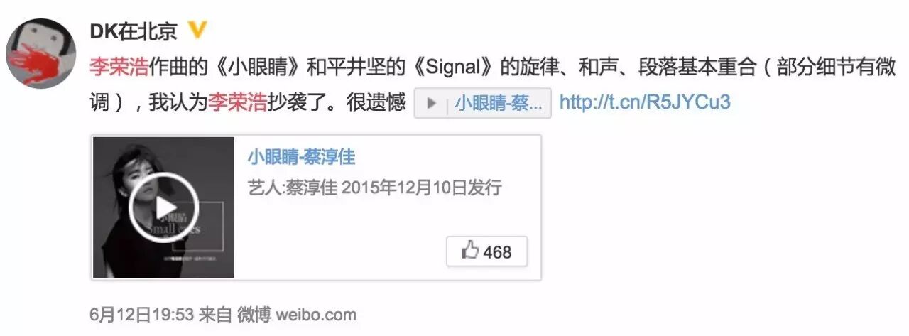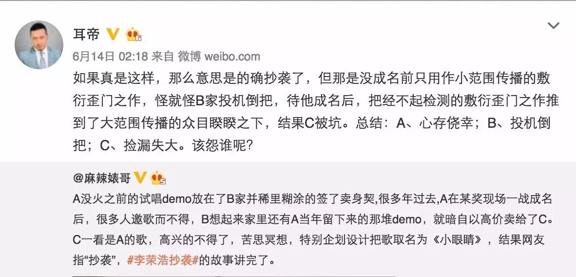 这两天“李荣浩抄袭事件”在微博闹得沸沸扬扬的,微博上最活跃的几个音乐大V都发表了自己的看法。