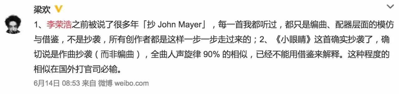 当然,大V们的看法仅仅代表个人判断,并不足以作为判定“抄袭”的证据,所以,本文的立足点在“李荣浩疑似抄袭”,而非确定抄袭。