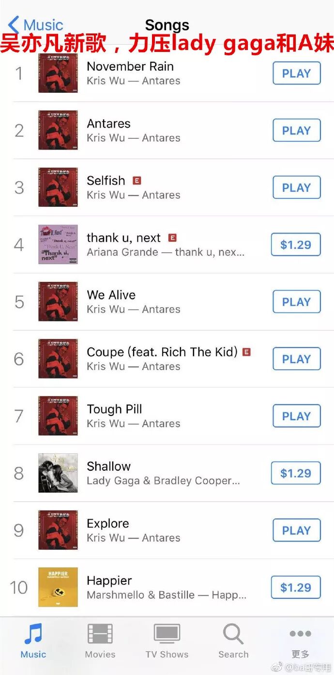 这位歌手就是前任EXO分队的队长吴亦凡Kris,霸榜的则是他的新专辑《Antares》。