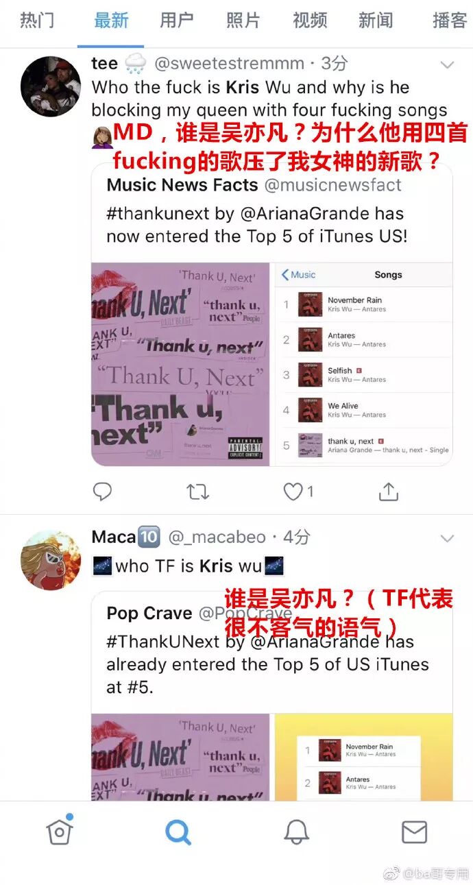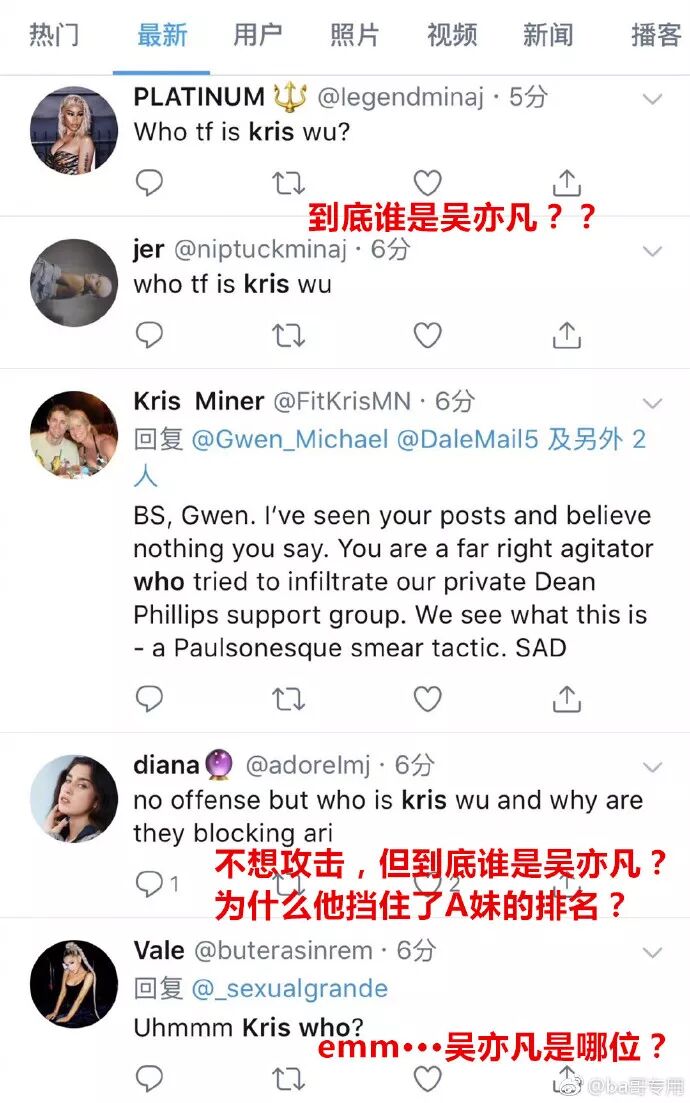 目前Ariana粉丝的反响很大,推特上全是对Kris Wu的恶言,我猜,这又是一场腥风血雨。
