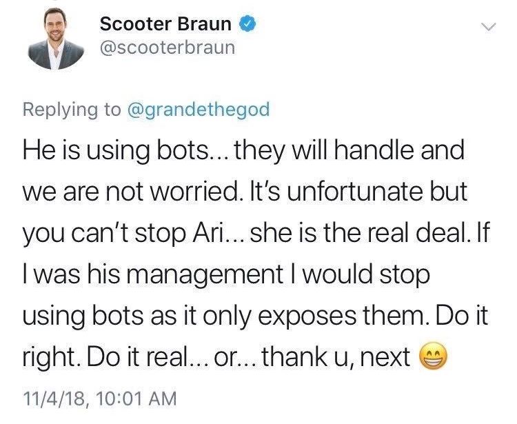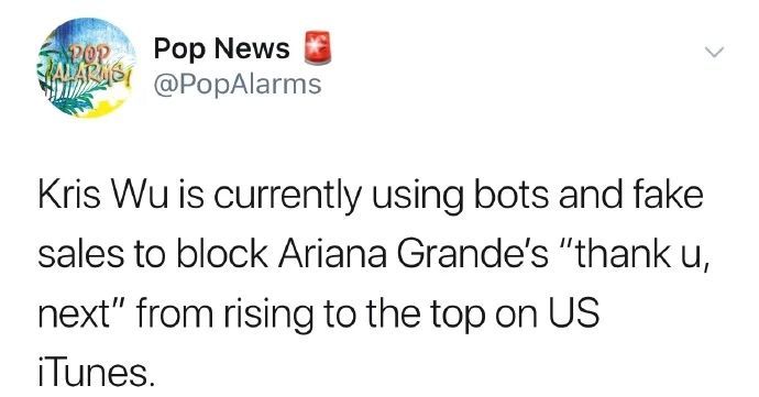 而Ariana小姐的经纪人Scooter在推特上发起第一轮Diss,回应对于吴亦凡粉丝刷榜美国iTunes一事,团队表示:"我们会着手解决,你们不用担心”