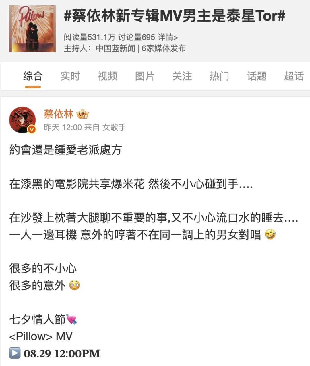 “Mommy”蔡依林很贴心地在情人节发布了新专辑收录曲《Pillow》的MV。