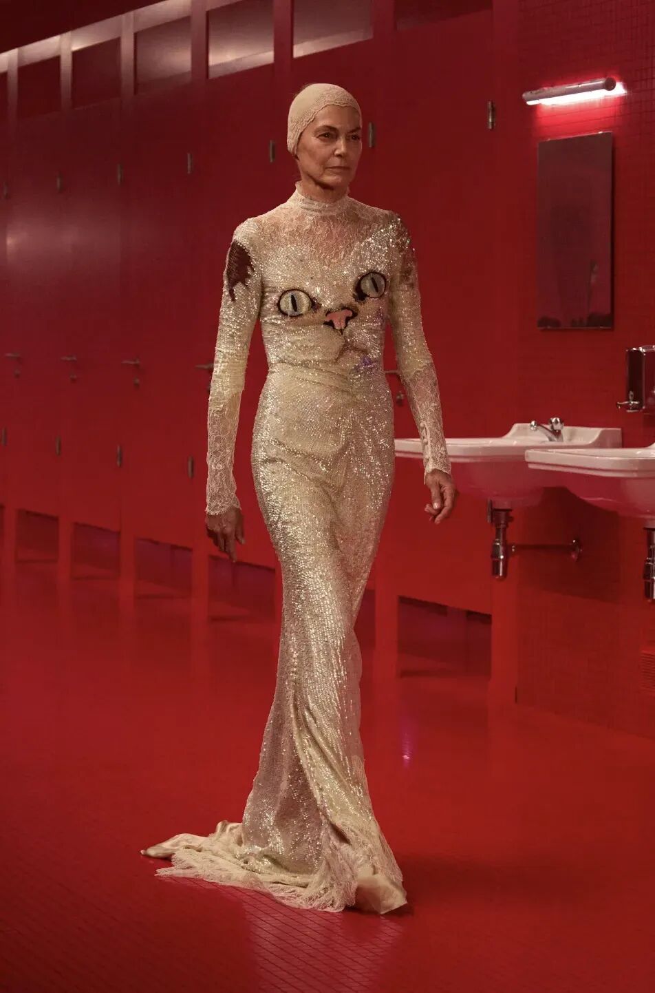而这些华服和 Jolin 这首歌也颇有渊源,在这一系列里,Michele 同样从“亲密的元戏剧”(Le Méta-Théâtre des Intimités)”这一命题出发,回到对自我身份认同的探讨——选择卫生间这一空间,并设置大量的镜面,也是为了映照这种私密的“自我审视”。