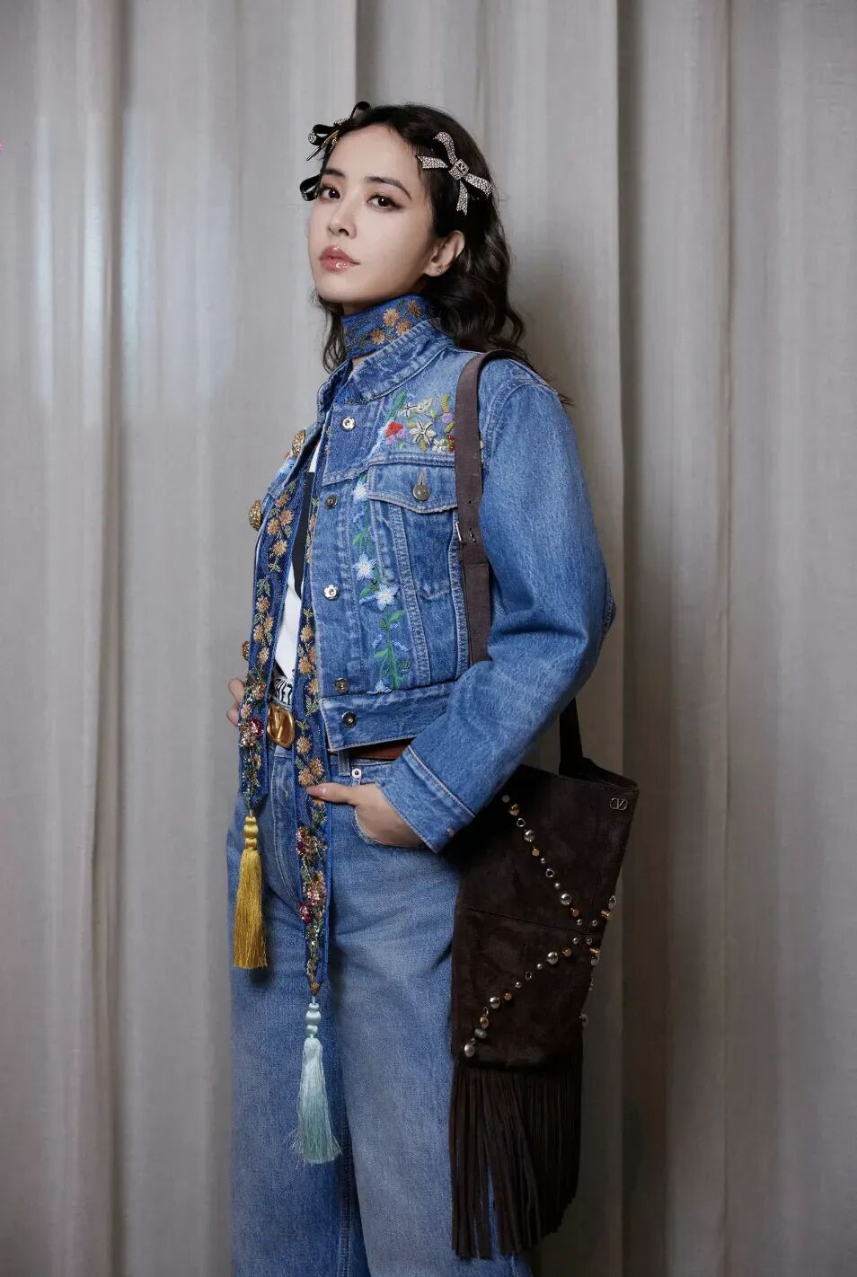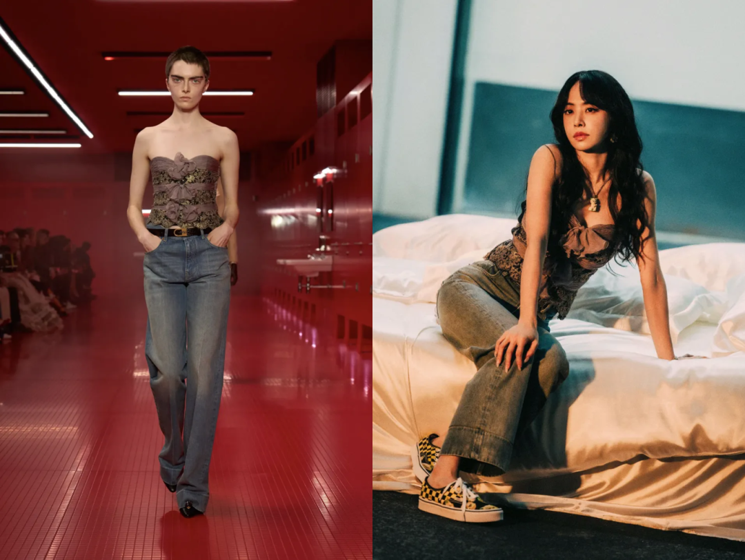 紧身胸衣搭配 70 年代风格牛仔裤,则在搭配上透露了 Michele 的喜好;