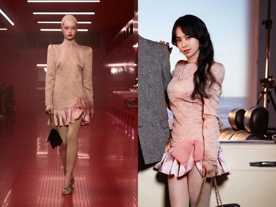 首先是这袭粉色裙装,用相近却不同的材质拼合而成,展示了 Michele 的标志性设计语言;