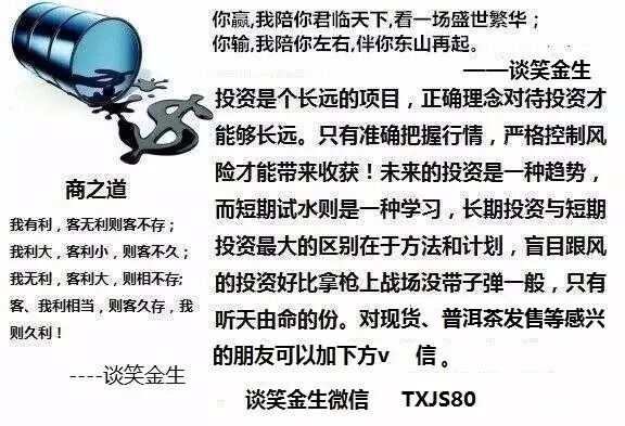 讨论完名人热点,再来聊聊投资心态:笔者常跟投资者说:做投资,学习第一,赚钱第二,这样的投资才是有价值的。你必须要有自己的判断,长期的知识的积累,你才可以不永远依附着分析师,才能在投资路上走得更远。投资是一个完整体系包括投资理念 ,投资心态 ,资金管理 ,风险控制 ,投资策略 ,操作系统。笔者经常专注研究国内经济形势跟国际形势以及各国之间的动态,对天然气,原油,白银,黄金外汇,贵金属,等大宗商品及股票、普洱茶发售有深入的研究,关注本人都可以得到有效的投资指导!