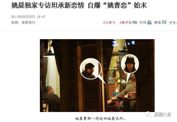 2个月后,还在《南都娱乐周刊》当记者的卓伟拍到了姚晨和曹郁。卓伟按照惯例通知了姚晨,而姚晨连夜打电话给了南都主编,接受了专访。姚晨把自己表述成为了心胸坦荡的阳光姑娘,只是在单身时勇敢追求自己想要的幸福。而曹郁是最懂自己的男人。