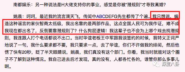 除了这几段之外,姚晨还有几段绯闻。其中有段比较重磅的,是大佬韩三平,被姚晨义正言辞地否认了。她还说,华谊不会炒作。