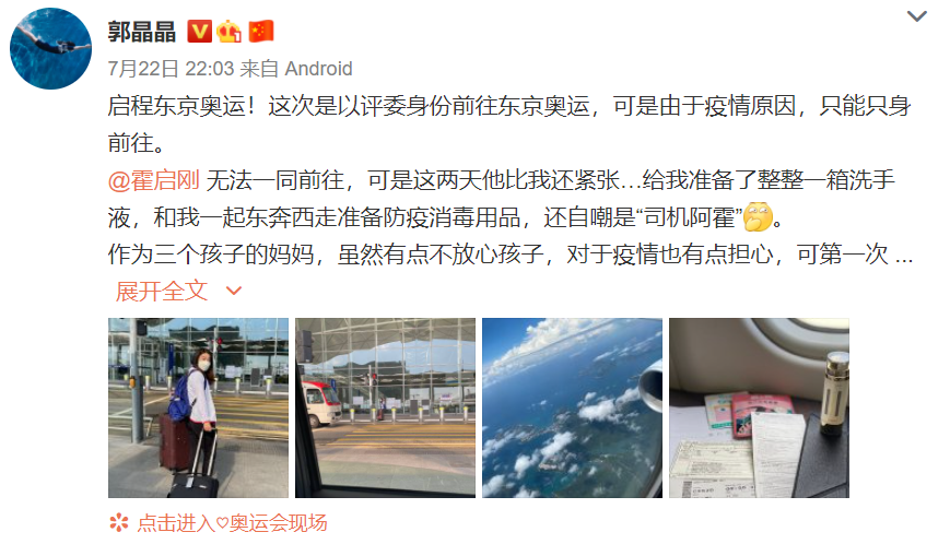 出发东京奥运会前,她在微博上晒出了老公霍启刚的送行照,分享老公给准备了整整一箱洗手液。