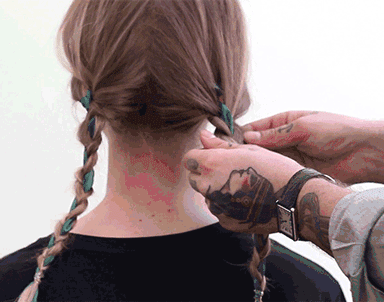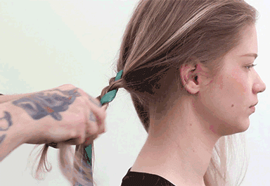 不段在后方加入新的头发加入到编织中,前额处也取出一缕新的头发,与刚才的最后一缕头发汇合。以此类推,向下编发至脖劲处。