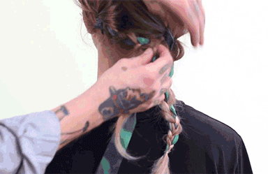 Step 5:随意的把马尾辫交叉盘在脑后,用发卡固定,直到全部辫子都盘在头部后面。这样会增加头发的蓬松感,制造出卷曲的视觉效果。