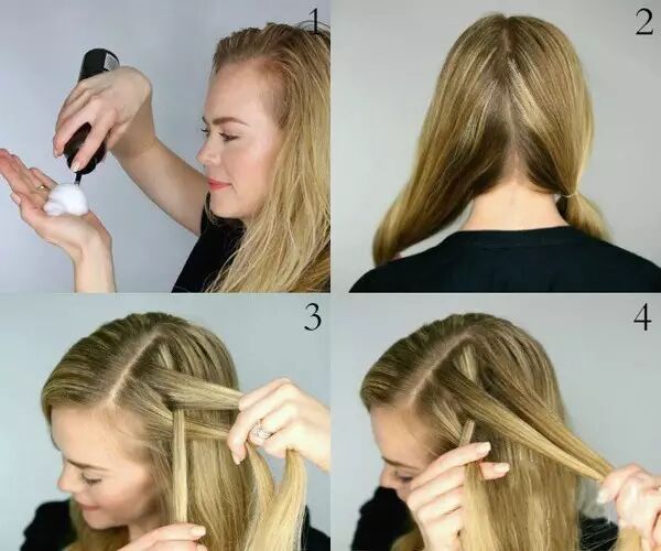 Step 5:从左边取头发,继续放在刚刚从右边取的发束上面。