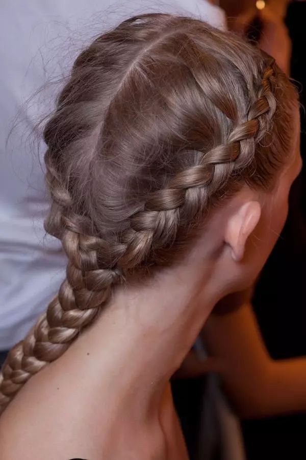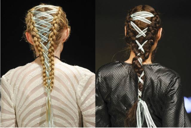 除了上面两种,今年的时尚圈又玩起了“丝带风”,秀场上各种大牌的包装丝带都被玩在的编发上,真别说,有品牌包装丝带的可别扔咯,废物利用起来还是挺带感的。