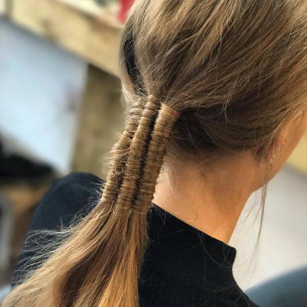 Step 3:用皮筋固定住辫尾末端。如果缎带有剩余,没关系,不用理睬它。