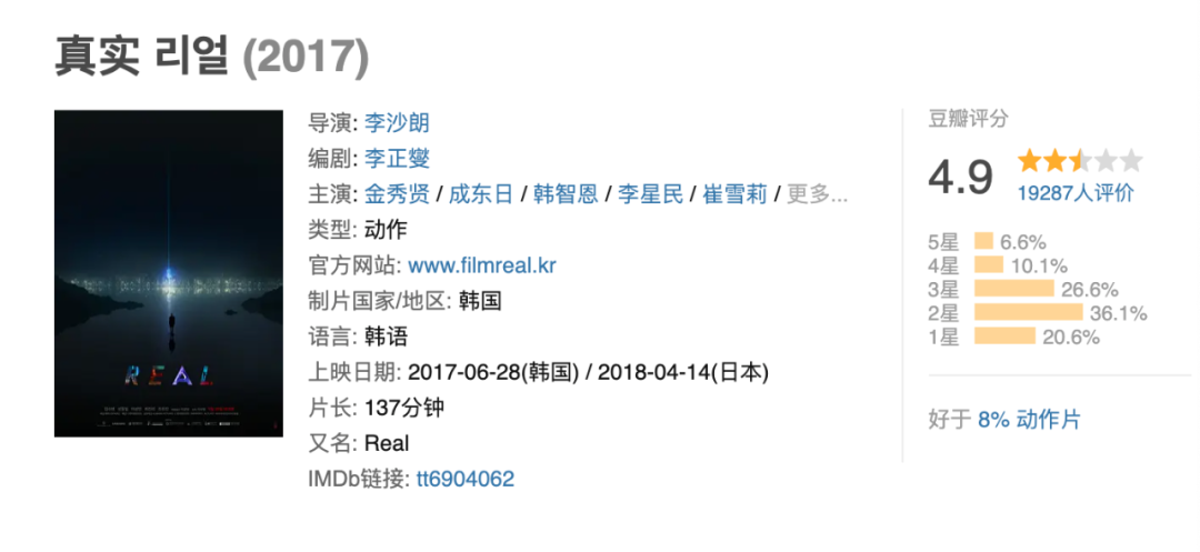 韩国主流电影评分网站naver上的评分只有:4.48(满分10)#要知道同期《变形金刚5》都拿了6.6#