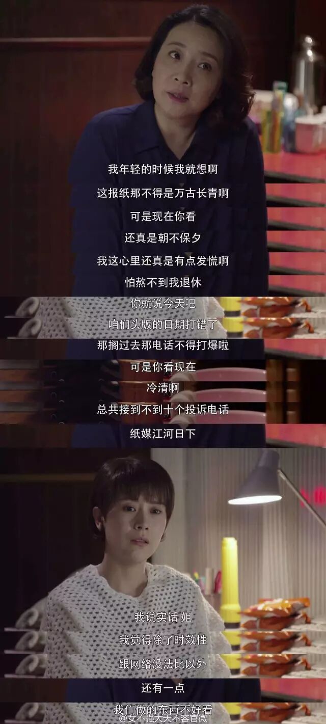 但面对新媒体的冲刷和人性的碰撞,这部剧不怕露骨的反映出当下的一个现状——纸媒正江河日下。