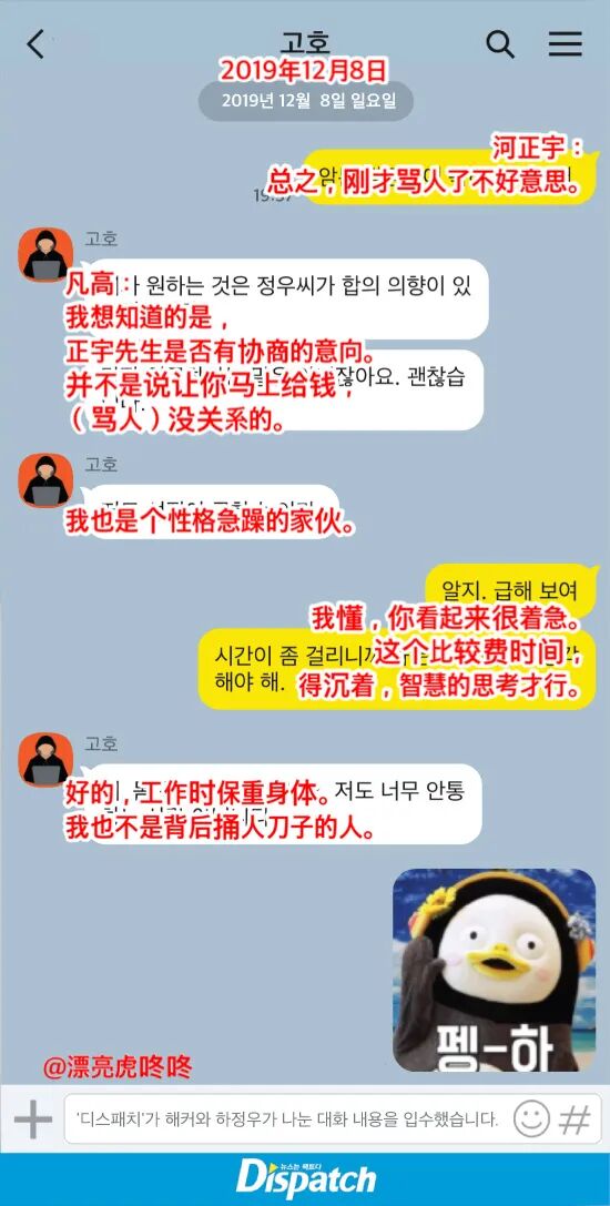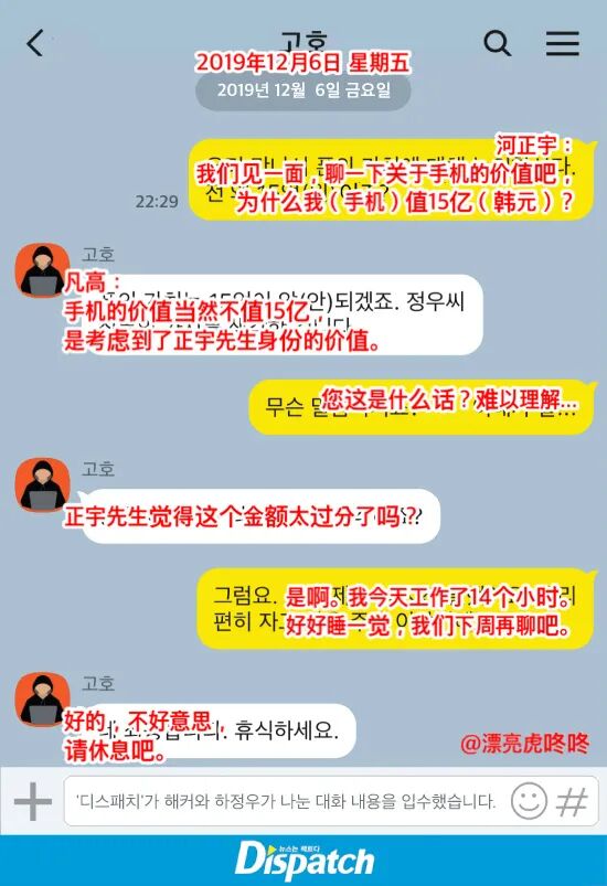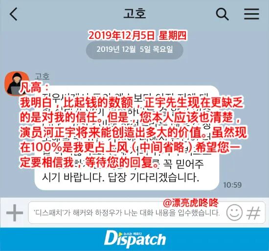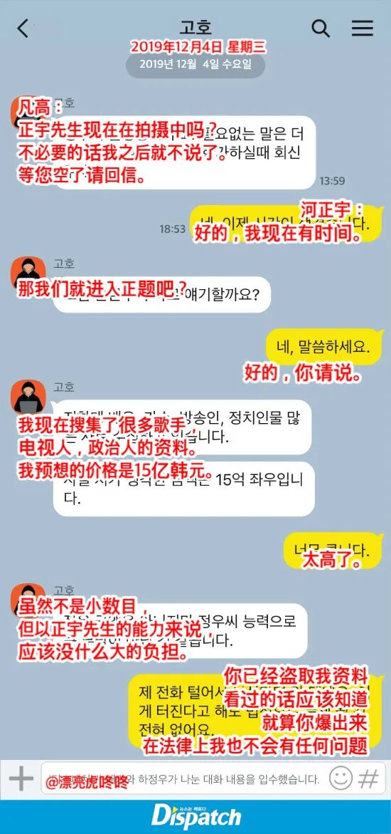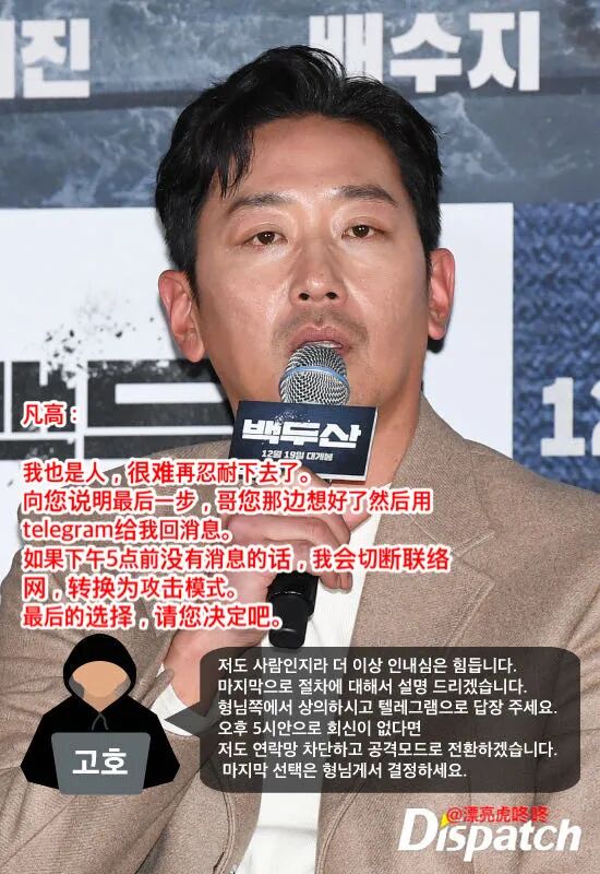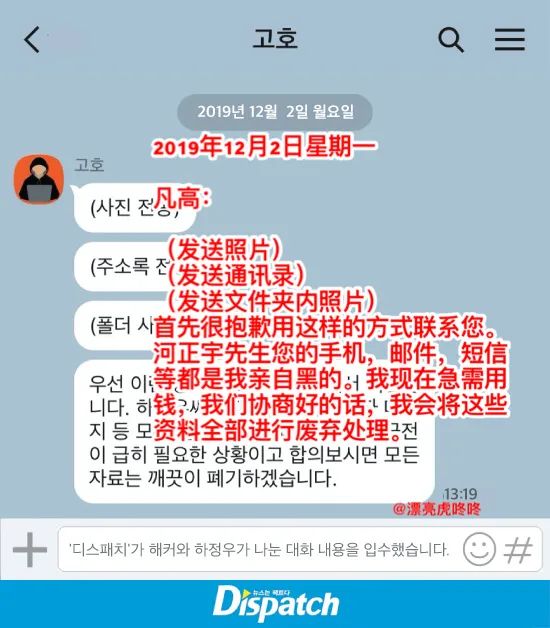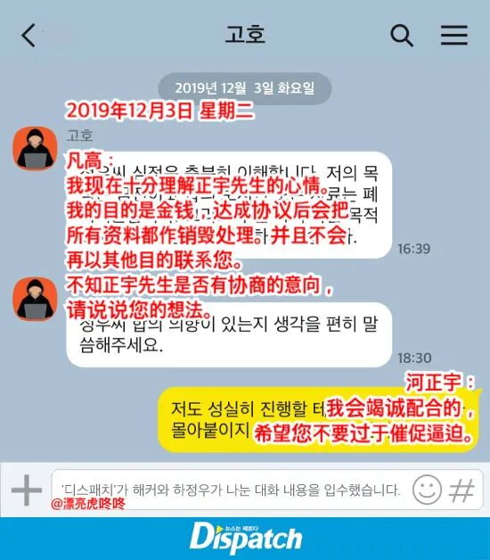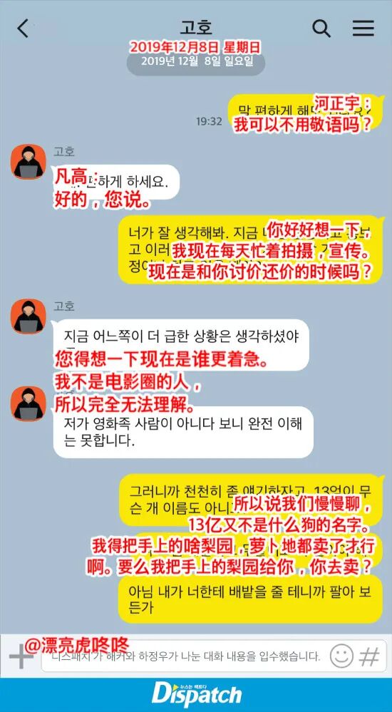 昨天,韩国知名的靠谱爆料媒体Dispatch公开了演员河正宇与试图敲诈他的黑客的长篇聊天记录。
