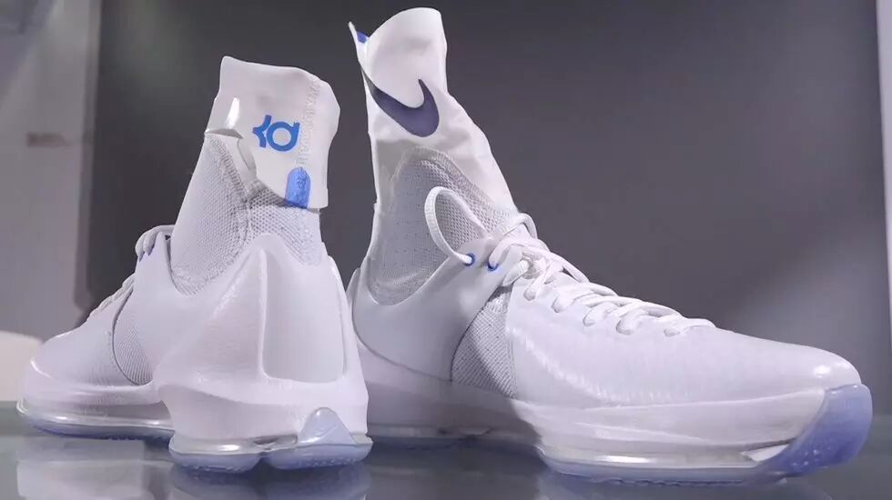 给了杜兰特体育史上最大单球鞋赞助合同(10年3亿美元)的Nike同学,常规赛设计的KD8让杜兰特同学遇到了好几次打着打着球,鞋掉了的尴尬,所以设计师发愤图强,为杜兰特征战季后赛推出史上最高帮篮球鞋——KD8 Elite。在它首次登场亮相的时候,便以它独特的连接鞋身的压缩袜设计引起了广泛的关注,褒贬不一。反正我是第一眼看了之后就决定等上市之后一定得入手感受一下啦!