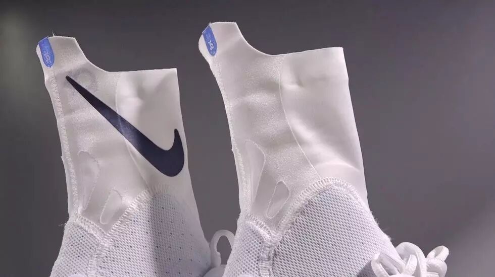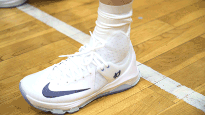 接下来重点来啦!鞋帮直接连接小腿的丝袜设计!不对不对,是压缩袜!这个设计让KD8 Elite超越了Kobe 9 Elite和AJ XX8,成为了史上鞋帮最高的篮球鞋!这个设计比较挑穿着者的腿型,特别适合杜兰特这样小腿又长又细的人,小腿粗壮和小腿短的穿起来的效果可能就没那么好了吧。